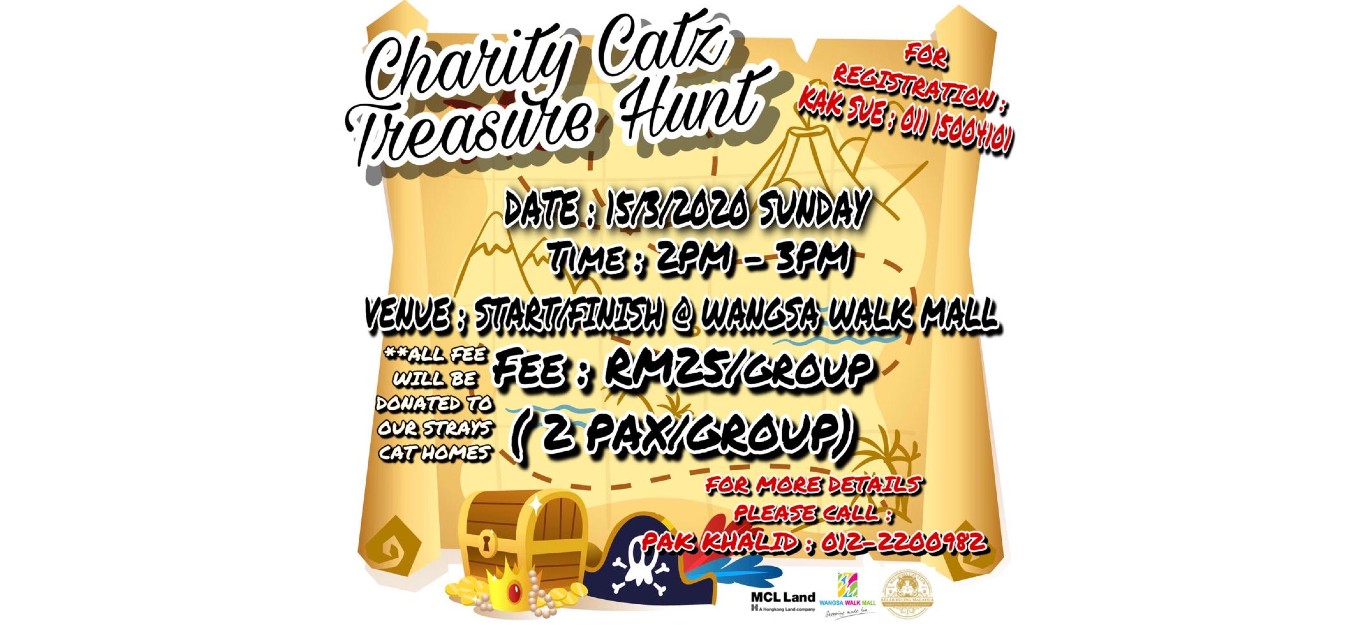 Charity Catz Treasure Hunt. Date : 15 march 2020 Sunday. Time : 2.00 pm - 3.30 pm Venue: Start /Finish @ wangsa walk mall, Setiawangsa, Kuala Lumpur. Fee : RM25 per group (2 pax per group) & all fee will be donated to our strays cat homes organise by KKM and Wangsa Walk Mall . Others activities % * Adoption Campaign & re home cats * Charity Bazaar - for strays cat homes * Giant Snake & Ladder games. * Dr Vet - talk on cats and needs. * Free Green shopping bag for first 100 who installed wangsa walk mall App. * many more For registration pls call : Kak Sue at 011 1500 4101. For more detaiks kindly call Pak Khalid at 012 2200 982 @ Wangsa Walk Mall