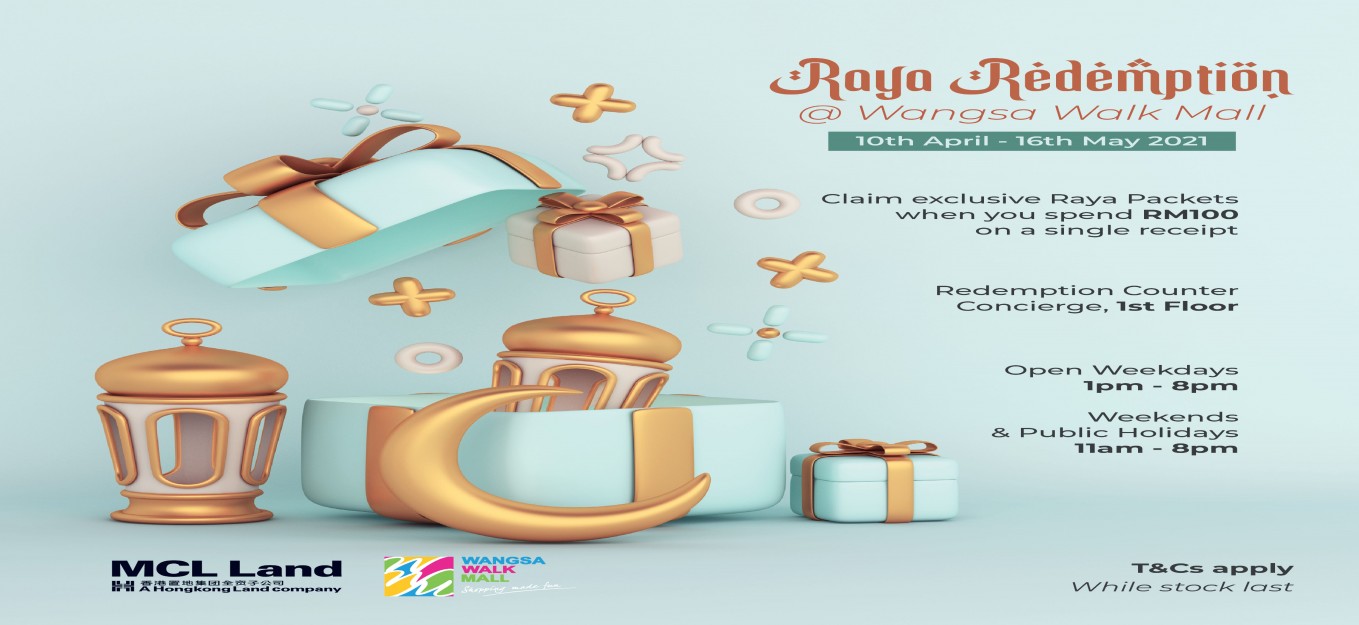 Enjoy exclusive Raya Redemption from 10th April to 16th May 2021. 💌 😍 Purchase *RM100 and above in a single receipt at any shop of Wangsa Walk to redeem exclusive Raya Packets. Only @ Wangsa Walk Mall. Available while stocks last. ▪️ *Terms and conditions apply 📍 Redemption counter collection is located at Concierge, 1st floor 🕙 Open Weekdays - 1pm - 8pm; Weekends and Public Holidays - 11am - 8pm Do your shopping with us this Ramadhan for better rewards.
