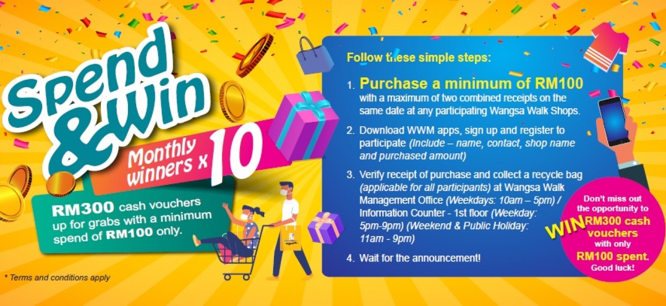 Spend a minimum RM100.00 (in a maximum of two combined receipts) on the same day at any participating Wangsa Walk Mall Shops to stand a chance to win a Cash Voucher worth RM300.00. Wangsa Walk Mall Management will randomly select 10 monthly lucky winners.